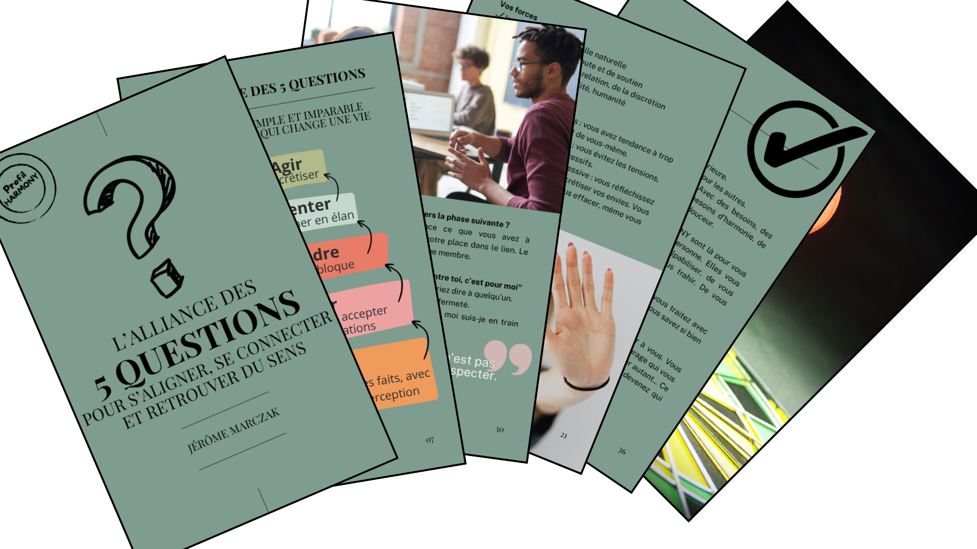 Si ces profils vous parlent particulièrement (faites les tests au préalable gratuitement pour savoir si besoin) ou que vous avez besoin de développer ces traits de personnalité et ces compétences humaines, l'Alliance des 5 questions HARMONY vous sera précieuse pour vous aligner, vous connecter et retrouver du sens !